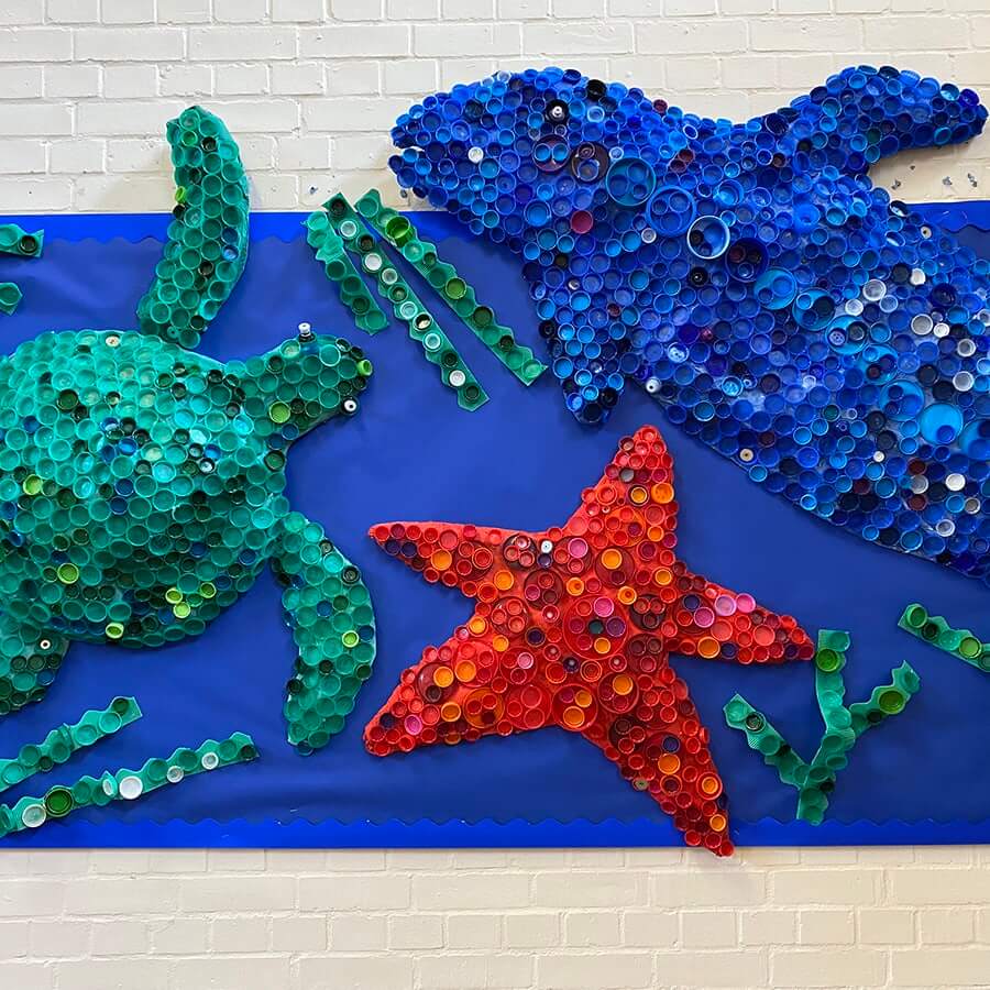 The competition attracted more than 100 entries, created by students aged 5 through 11. By the time the August 31 deadline rolled around, the young artists had put more than 90,000 bottle tops to better use in their art. Vibrant fish, great white sharks, jellyfish, octopuses, seahorses and even mermaids made appearances among the art, presenting the judges with a unique challenge: to pick the winner among a sea of unique creations.